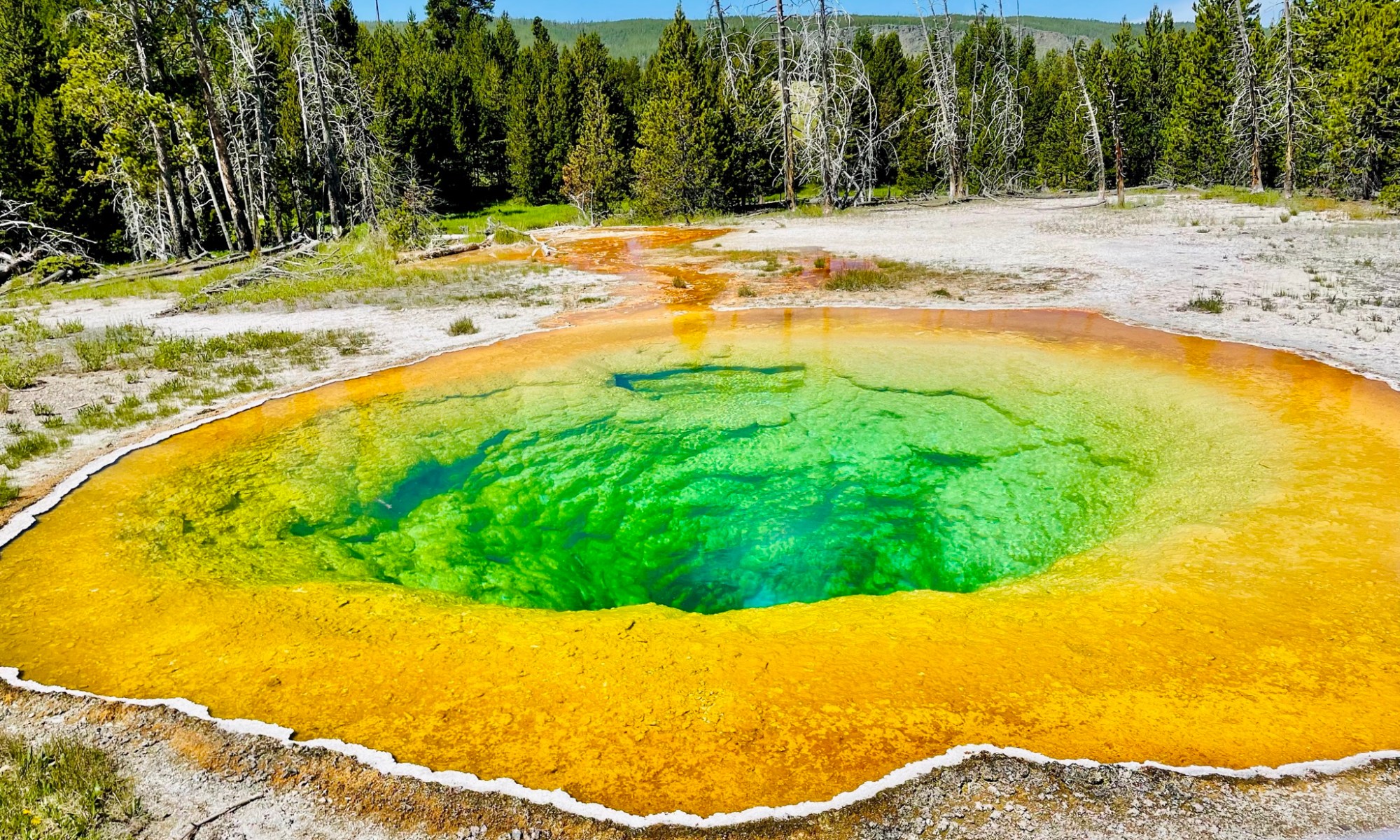 This was one of my favorite geothermal ponds that is right next to the grand loop road and has 2 bubbling hot pools and yellow flowers that line pond’s edge. The overall effect of pond with flowers and thermal pools is very unique and eye catching
