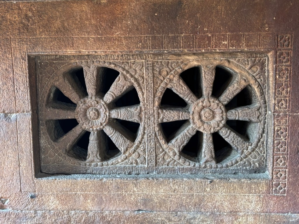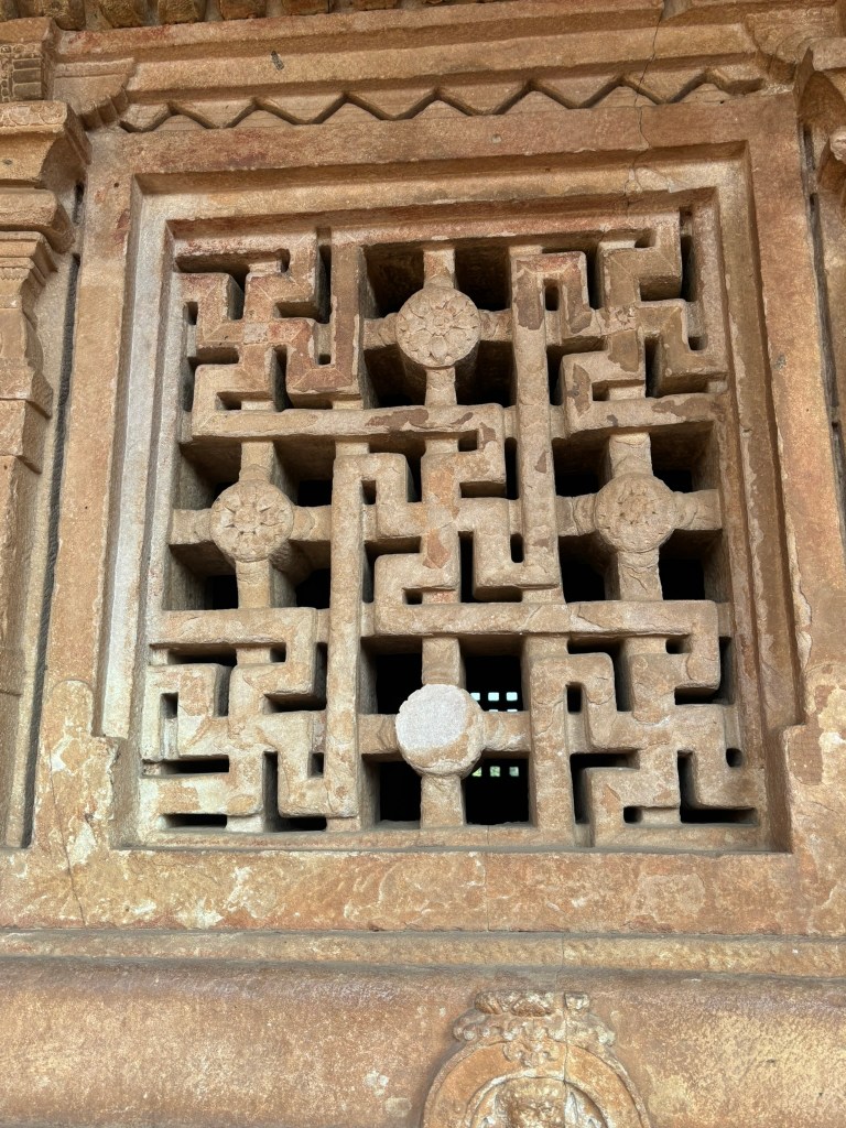 Alternating with the panels are the perforated windows, which let air and light into the inner sanctuary. There are various designs, including wheels with fish spokes. There are also Swastika signs with lotus. The Swastika is considered sacred in Hinduism, Buddhism, and the Jain faith.