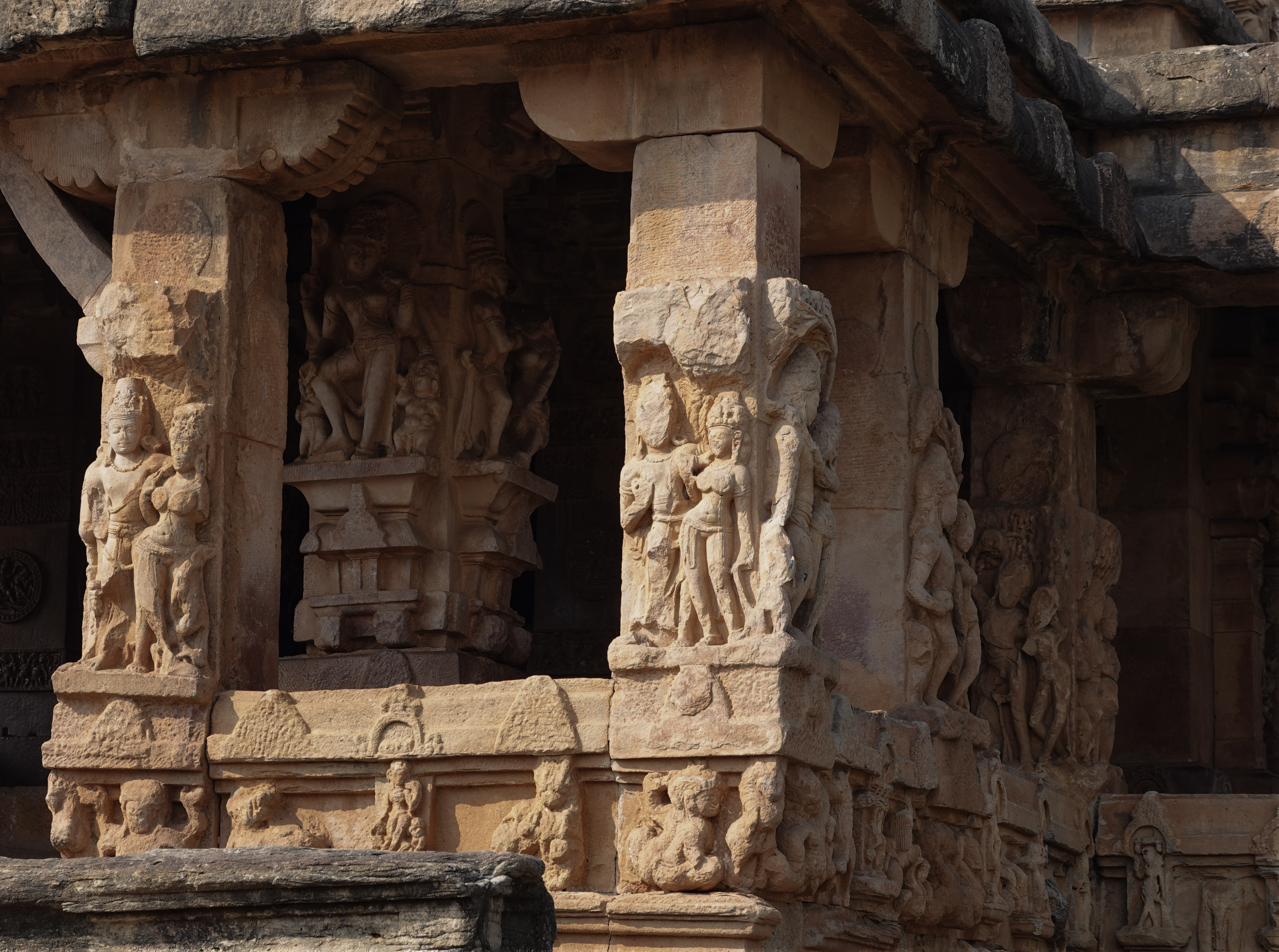 - Carved Pillars: The surrounding pillars and pilasters are adorned with various bas-reliefs, including mithuna (amorous couples), male musicians, and a series of female figures (apsaras).