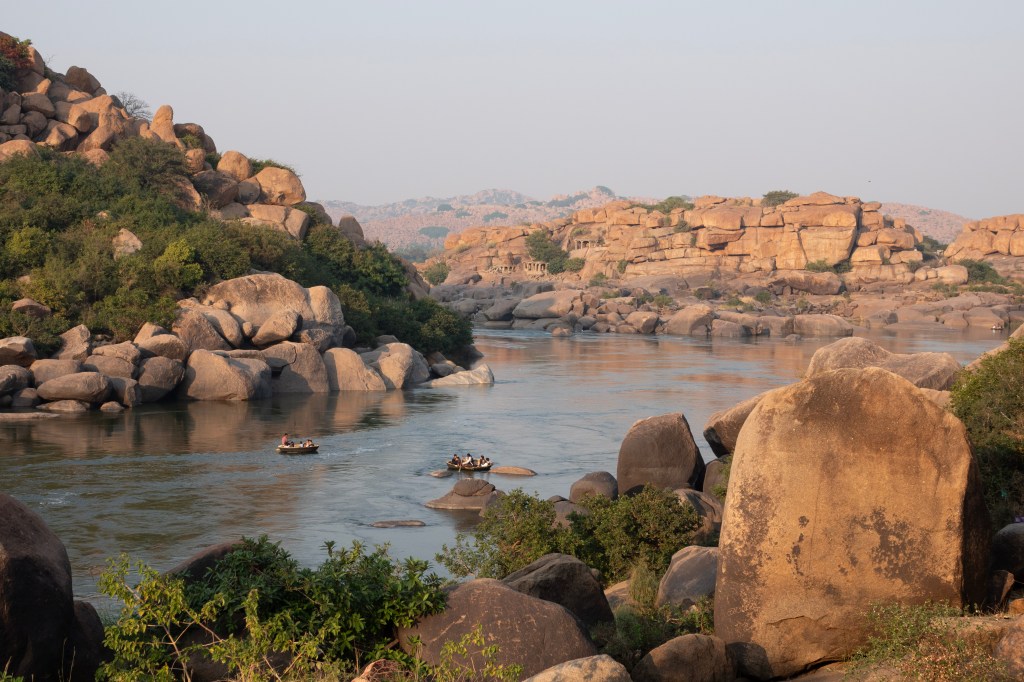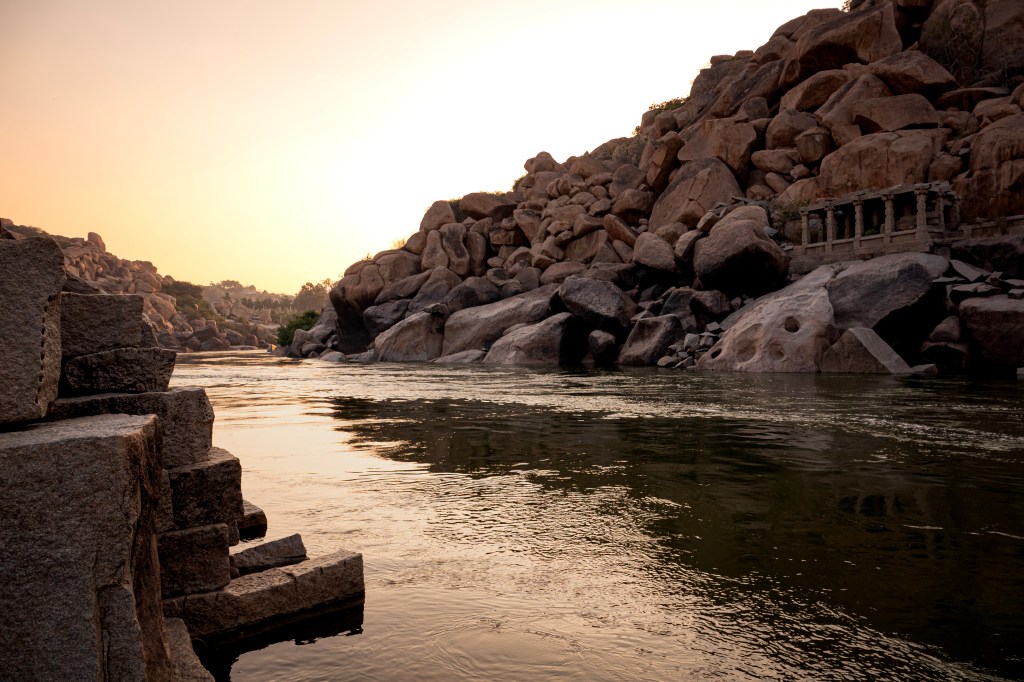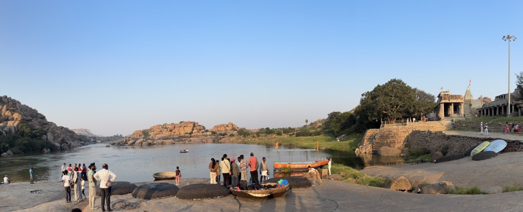 From the flat rocky bank—etched with Shiva lingas, footprints, and devotional carvings—you’ll spot coracles drying in the sun. These round bamboo boats, tar‑coated and impossibly light, are your gateway to one of Hampi’s most serene experiences.