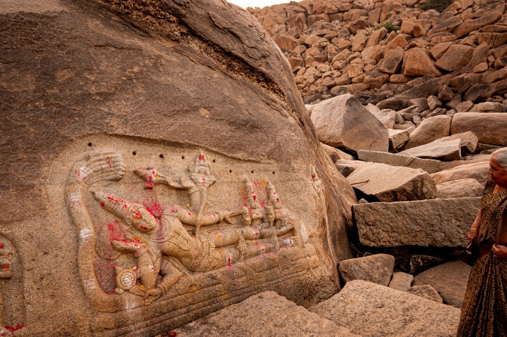 Further along the river, tucked between boulders and half-hidden by the landscape, is one of Hampi’s most peaceful carvings. It is Anantasayana, the reclining Vishnu.