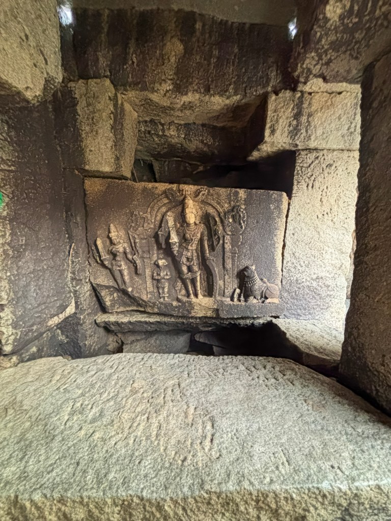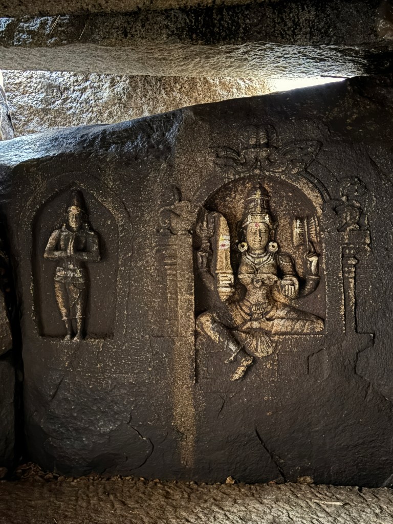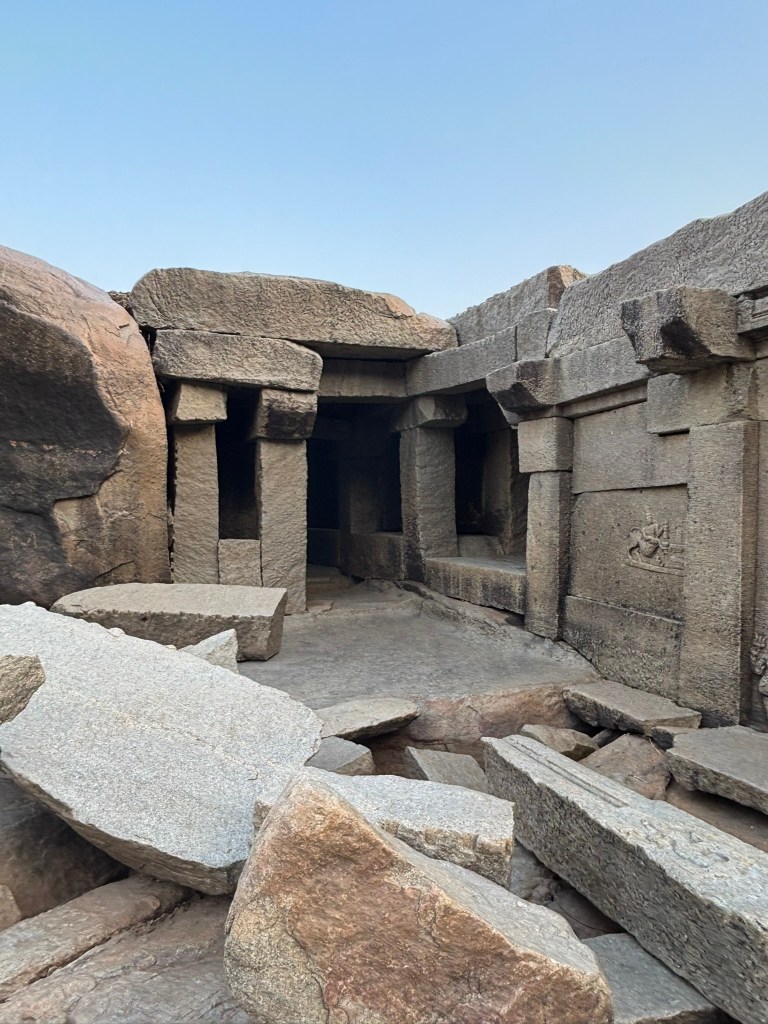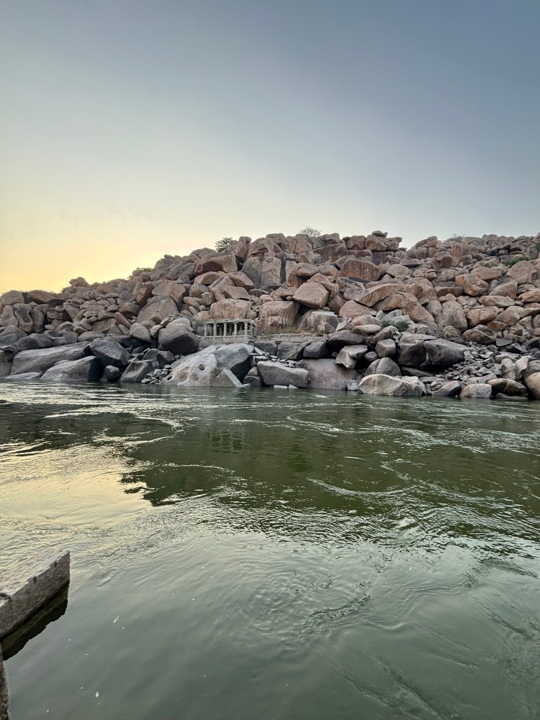 You can also visit the Narashimha temple on the same coracle ride. We ran out of time and couldn’t visit the temple. A short walk takes you through scattered boulders and ancient stone steps. They lead you to the temple. Its weathered facade blends seamlessly into the rocky hillside. The temple is a multi-story structure with characteristic Vijayanagara-style pillars. It has three sanctums originally dedicated to different forms of Vishnu: Venugopala, Lakshminarasimha, and Vishnu-Purushottama.