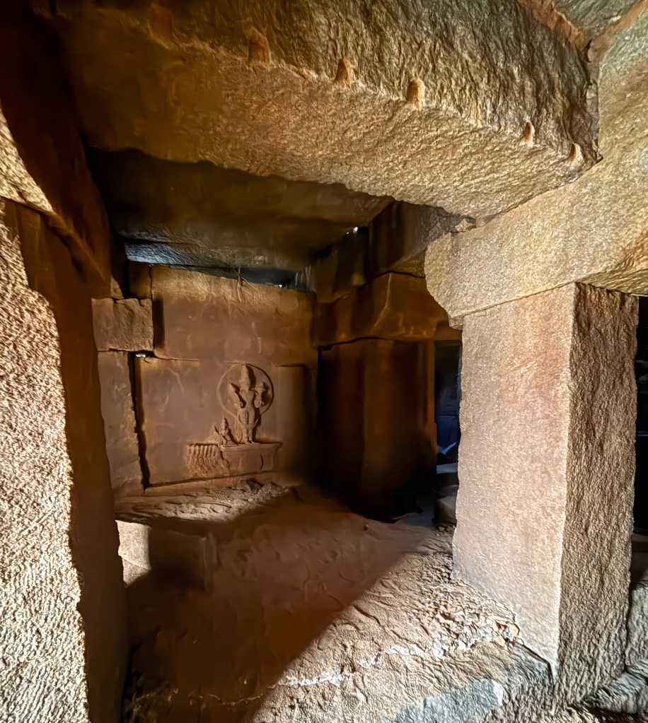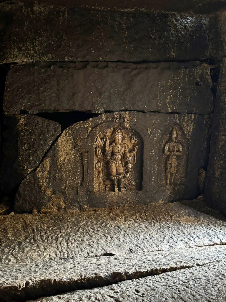Here, Vishnu rests on the serpent Adishesha, eyes half-closed, the world held in balance by his cosmic sleep. The carving is weathered, softened by centuries of wind and water, but its serenity is unmistakable.