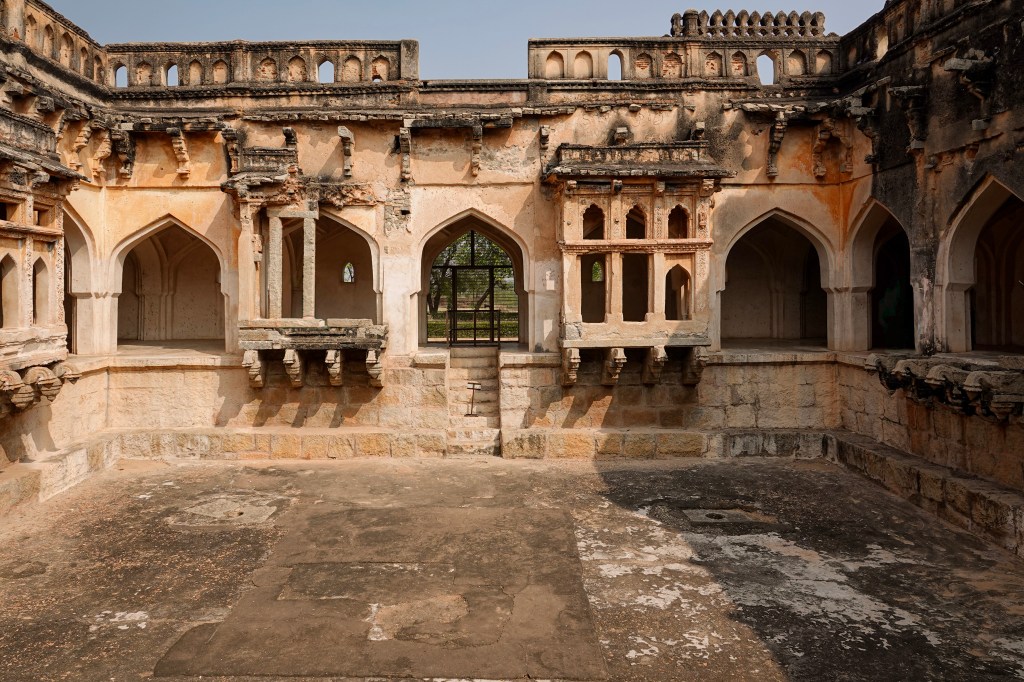 Despite its romantic name, the Queen’s Bath was likely never an exclusive bathing space for royal women. Instead, it functioned as a refined pleasure pavilion for male courtiers and their companions—a social and recreational space rather than a secluded retreat. From the outside, the structure appears almost austere, with plain, unadorned walls that give little hint of the elegance within. Step inside, however, and the atmosphere transforms. A graceful arcaded corridor wraps around a large square pool, its ceilings decorated with ornate vaults of varying designs. Delicate balconies with arched windows once projected over the water, their plasterwork now lost to time but still easy to imagine in their original finery. Historical watercolours show that the bath once had towers rising above the roofline, adding to its architectural drama. Surrounding the pavilion is a water channel that once fed the pool, and not far away lie the remnants of a collapsed aqueduct—part of the sophisticated hydraulic system that supplied the entire royal centre. Even in its ruined state, the Queen’s Bath captures the leisurely grace of courtly life and the Vijayanagara empire’s mastery of water architecture