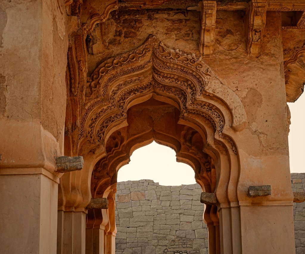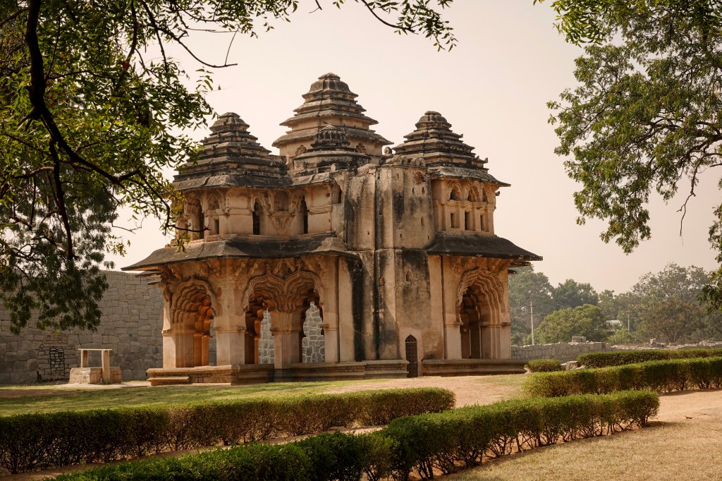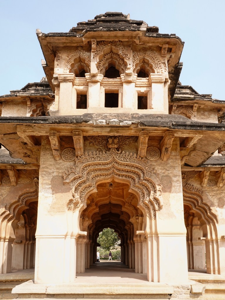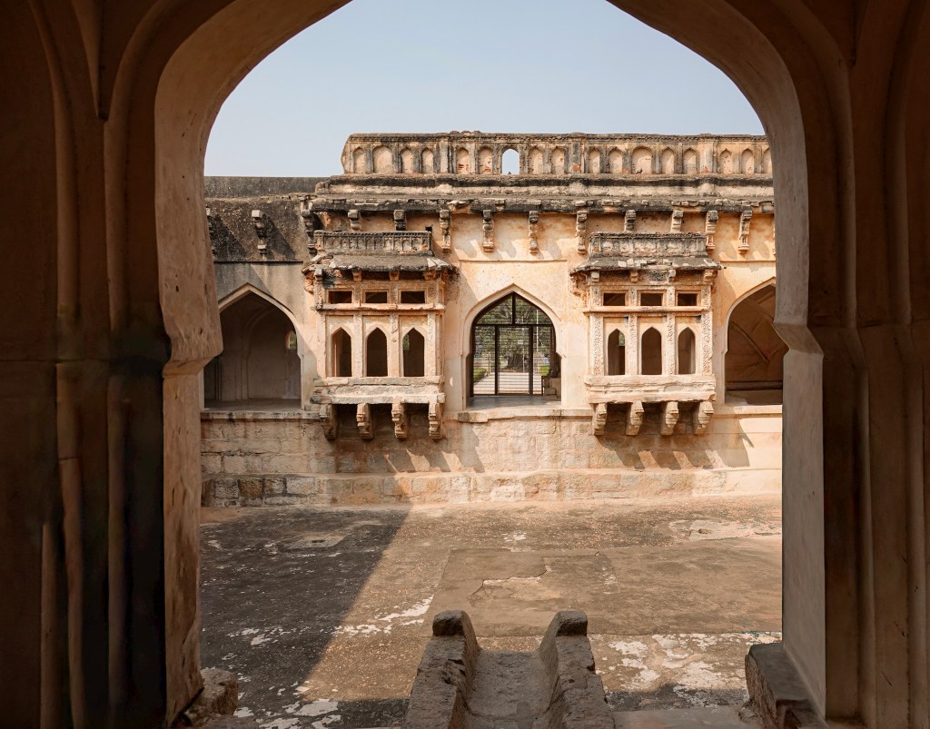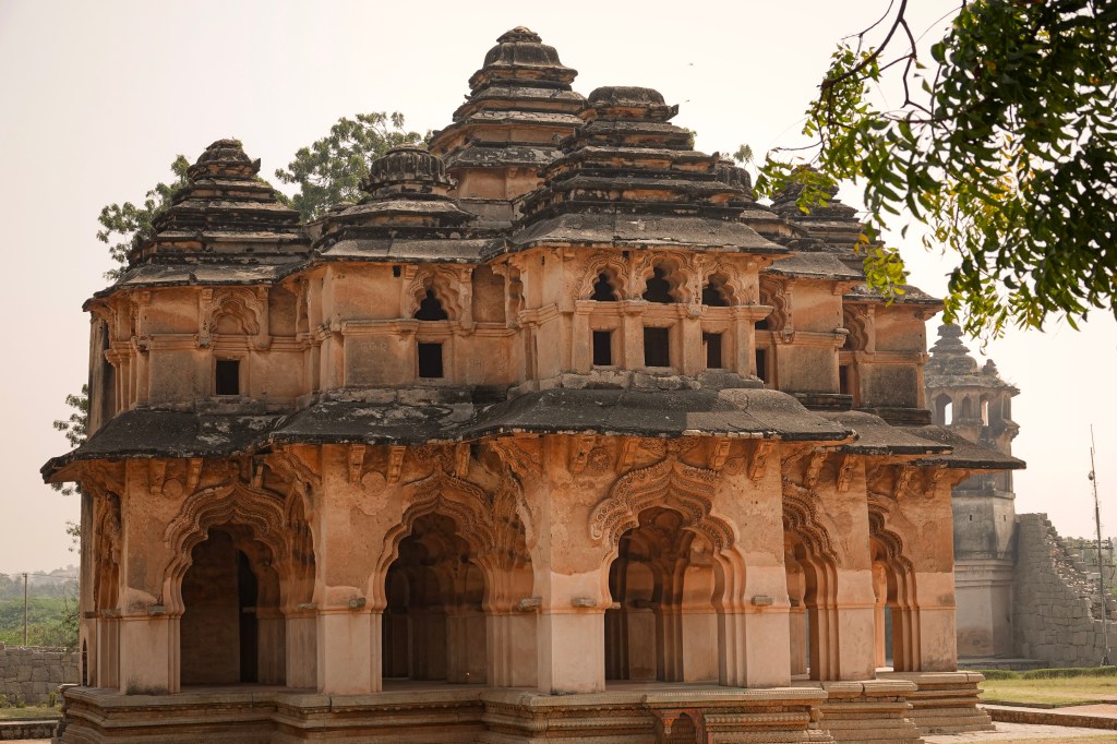 The structure sits on a square, mandala‑like plan with symmetrical projections on all four sides. The stone basement, double‑curved eaves, and pyramidal towers echo Dravidian temple architecture, while the lobed arches, plaster ornamentation, and domed ceilings reflect Sultanate influences. This fusion creates a building that feels both delicate and dignified, a perfect example of Vijayanagara’s inventive courtly style.