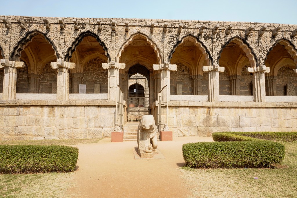 Step out of the Zenana Enclosure through a modest eastern doorway, and the landscape opens into a vast parade ground. On the far side stands one of Hampi’s most iconic structures: the Elephant Stables.