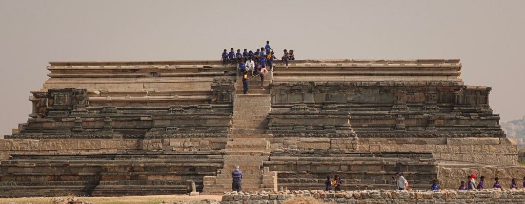 The lower granite tiers date back to the 14th century and are carved with lively scenes—kings receiving visitors, wrestling matches, hunting expeditions, dancers, musicians, and even foreign envoys with pointed hats. Elephants, horses, camels, and mythical creatures parade across the stone, capturing the cosmopolitan energy of the Vijayanagara empire.