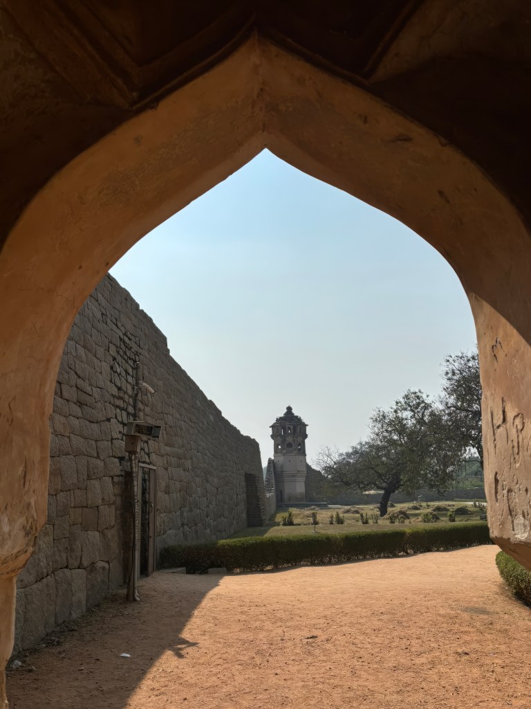 Three watchtowers—two intact, one partly ruined—stand guard along the enclosure walls. Like the Lotus Mahal, they mix temple‑style eaves with Islamic arches and domes. Their presence reinforces the idea that this was a protected administrative zone rather than a secluded women’s space.