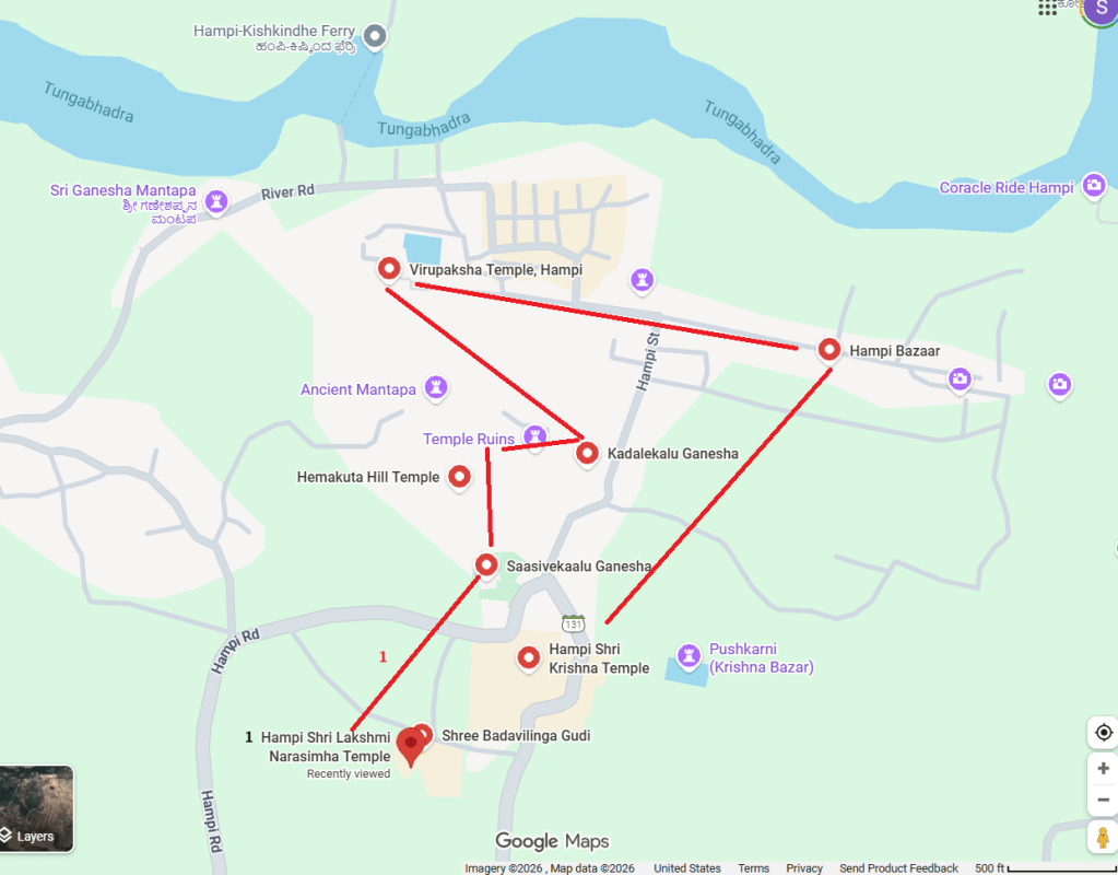 The entire city of Hampi is indeed huge. It’s possible to wander around the suburbs of the city for hours without bumping into anyone else. Seeing everything in Hampi would take several days. However, two to three days are enough to see the major monuments without it being repetitive. We saw Hampi in 4 segments with our guide. I will blog about each segment and its key monuments separately. Here is how we divided our itinerary of Hampi