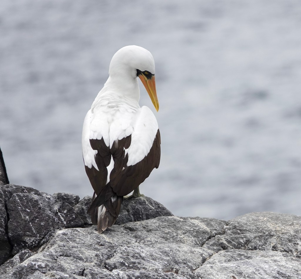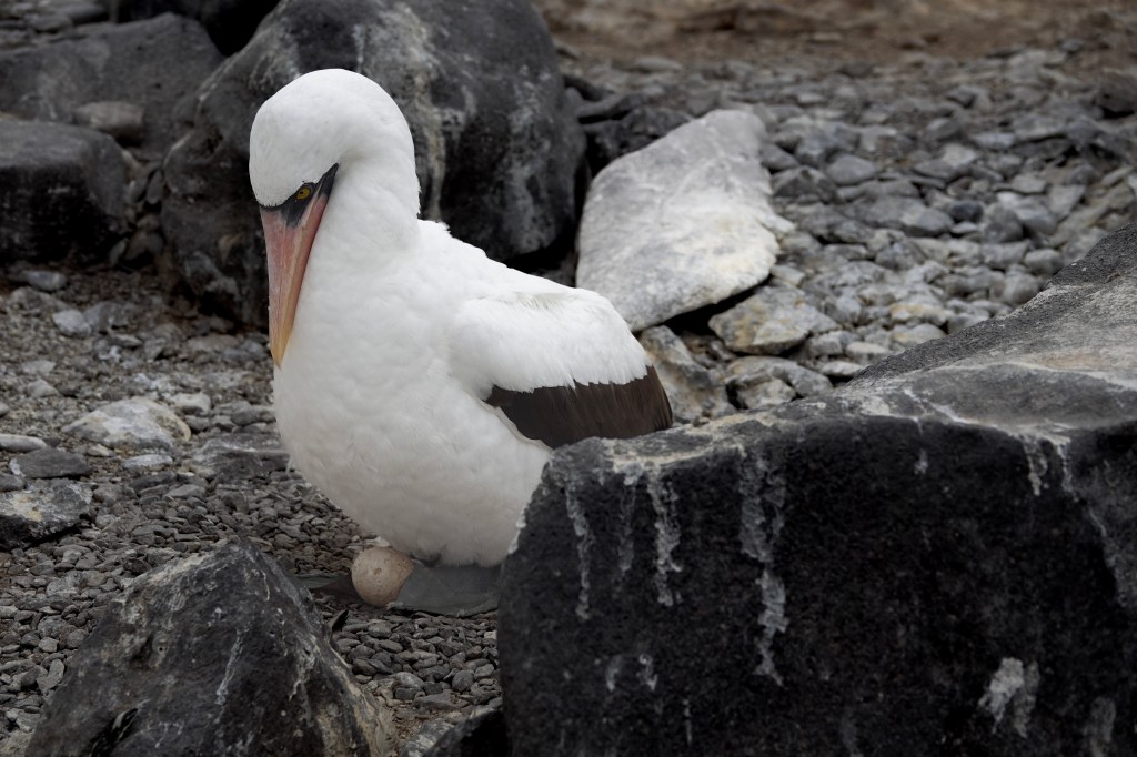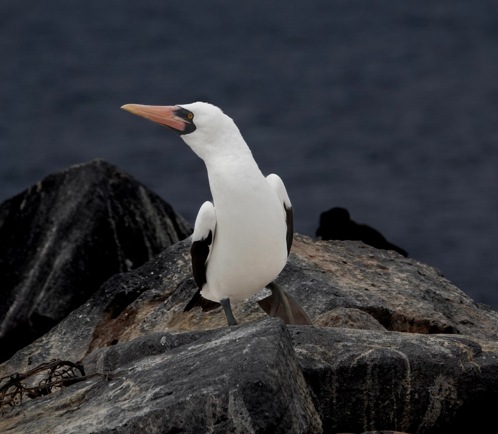 The largest of the Galápagos boobies, the Nazca booby also inherited the “bobo” nickname for its land-bound awkwardness, though its sleek white plumage, orange bill, and black-tipped wings give it a striking, almost regal presence. This species is best known for a dramatic behavior called obligate siblicide: parents lay two eggs, but only the stronger chick survives, ensuring that enough resources are available for one healthy fledgling. Despite this harsh strategy, Nazca boobies are captivating to watch as they glide effortlessly over the ocean and nest in dense colonies along the cliffs. They are most commonly seen on Punt Pitt, Genovesa Island, and Española Island, where visitors can observe their nesting sites up close along marked trails.
