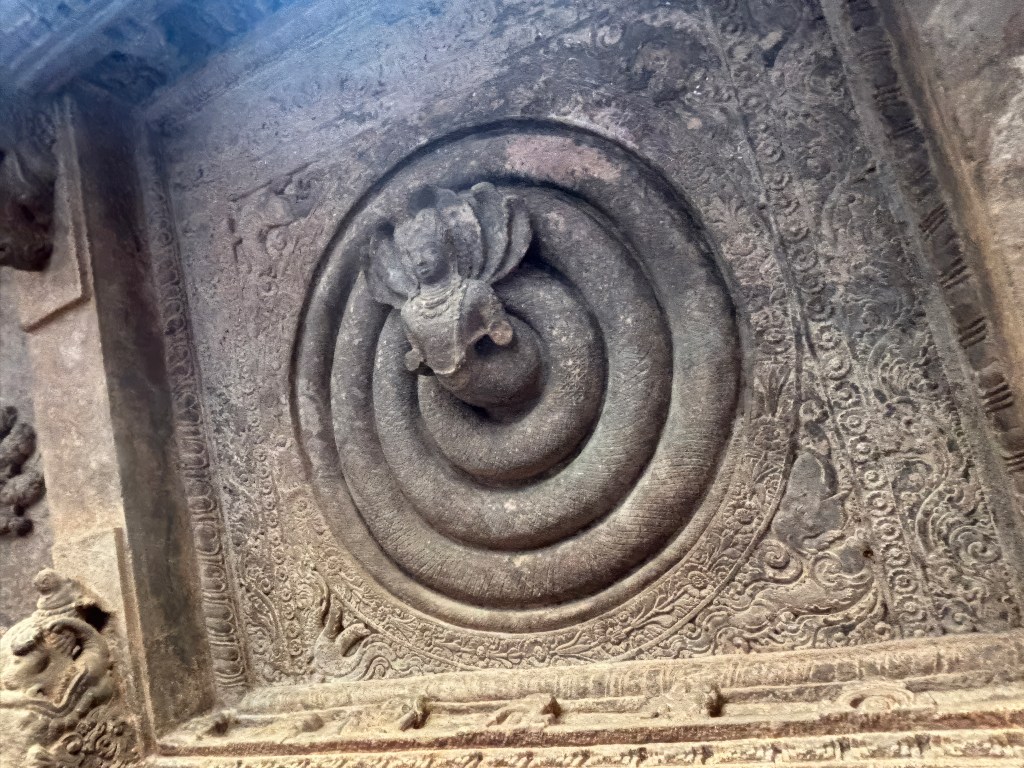 • Ceiling: The roof features intricate panels with bas-relief carvings. These include a notable “Matsya Chakra” (wheel with sixteen fish spokes). There is also a variety of swastika patterns. Friezes of flying couples (gandharvas and vidyadharas) and the churning of the ocean (Samudra Manthan) are also present.