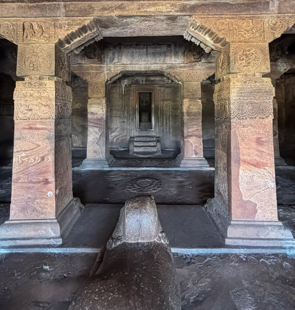 • Layout: The cave shares a similar layout to Cave 1. It features a pillared verandah (mukha-mandapa). There is also a central pillared hall (maha-mandapa) and a small, square sanctum (garbhagriha) deep inside
