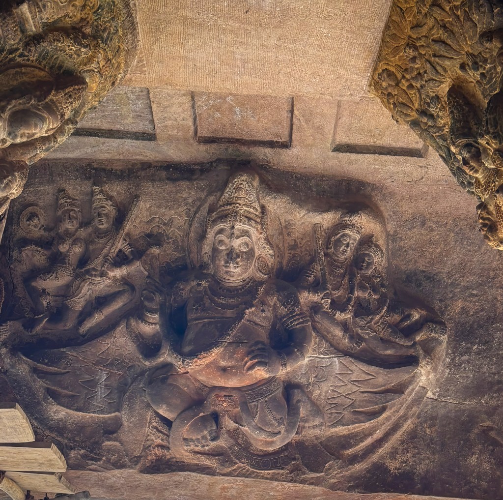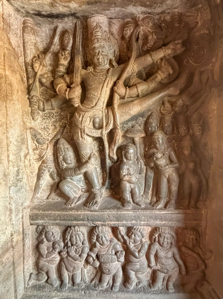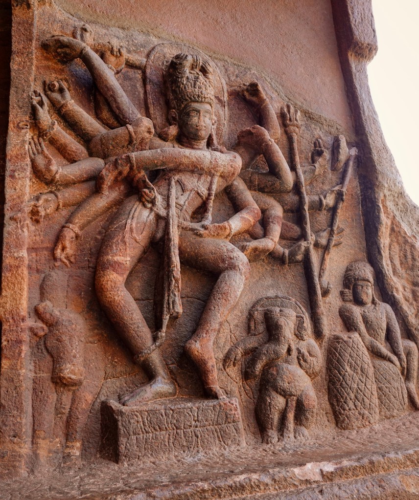 The cave’s most iconic feature is a 5-foot-tall relief of Nataraja, the 18-armed dancing Shiva. This masterpiece is noted for its mathematical precision. It depicts roughly 81 Bharatanatyam dance poses through different arm combinations.