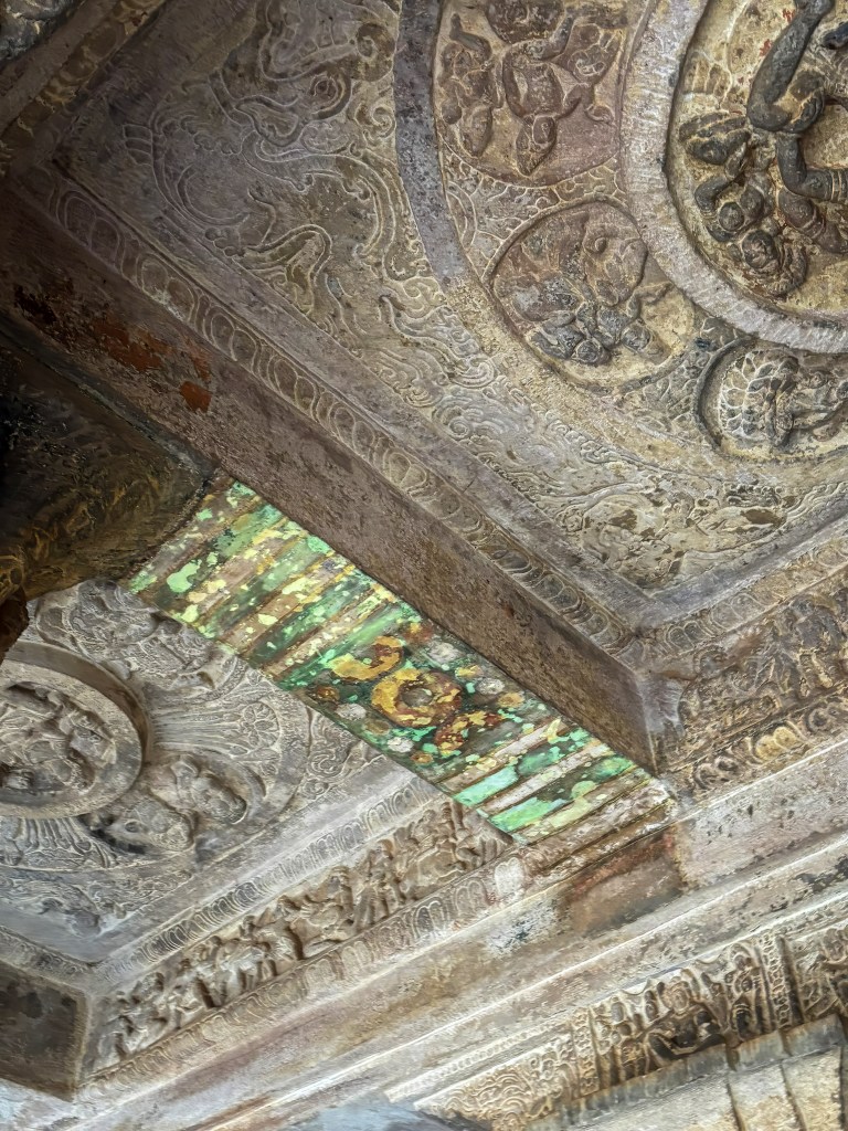 • Ceiling Art: The ceiling has a “Navaranga” (nine-section) design with a central lotus medallion on the floor below it, surrounded by carvings of the Ashta Dikpalas (guardians of the eight directions)