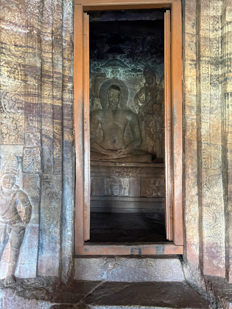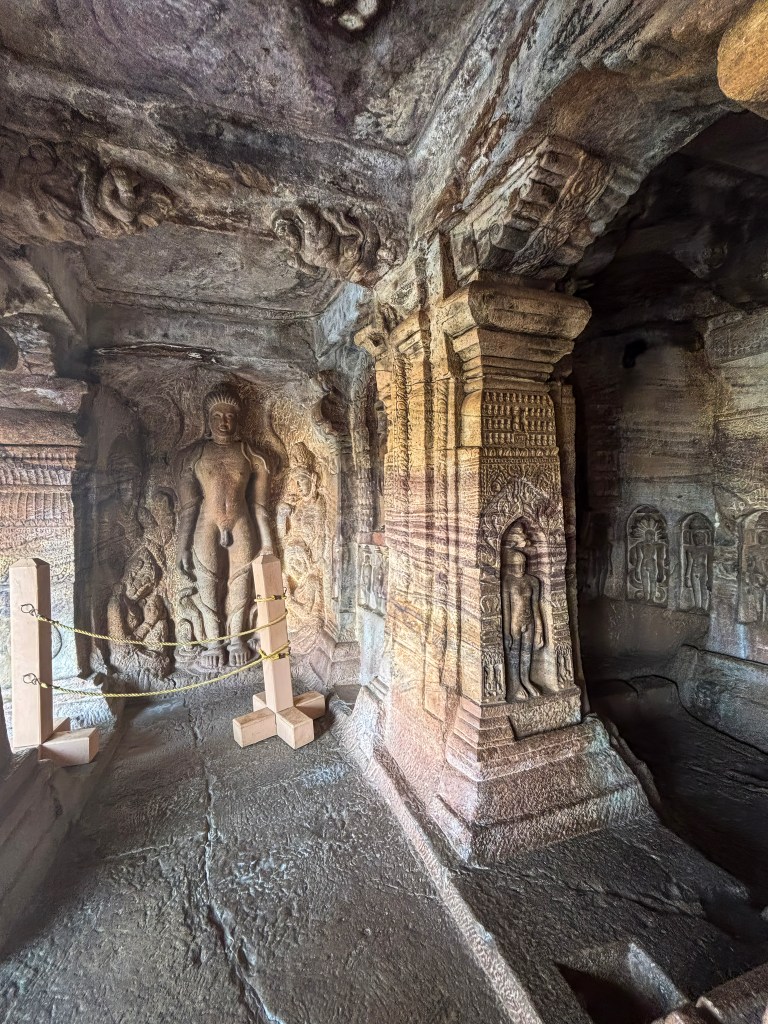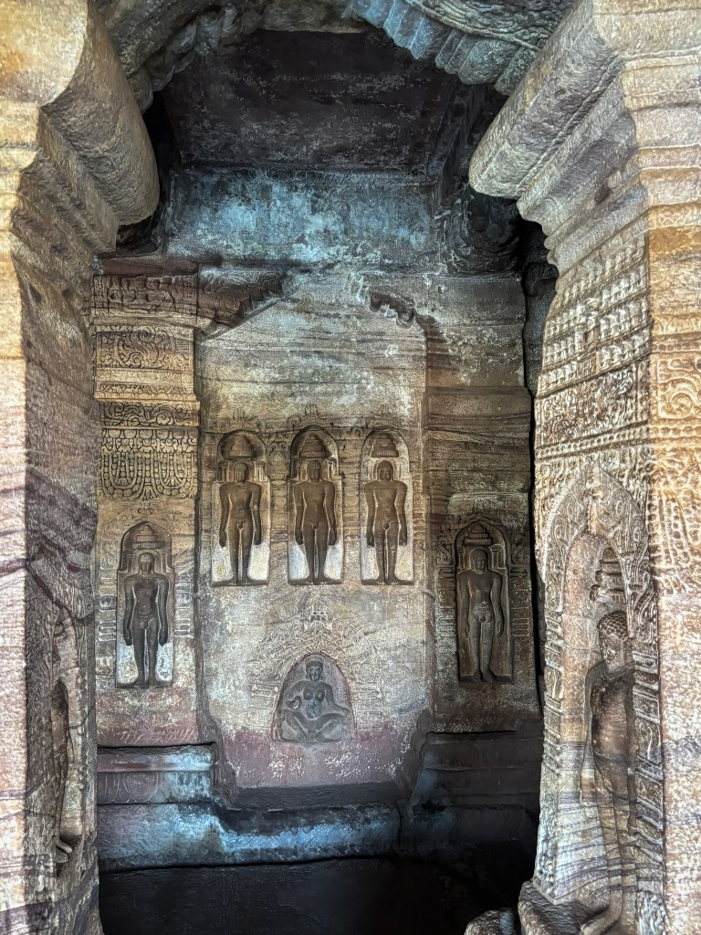 The cave is renowned for its detailed depictions of Jain Tirthankaras and deities in the Digambara (sky-clad) tradition.