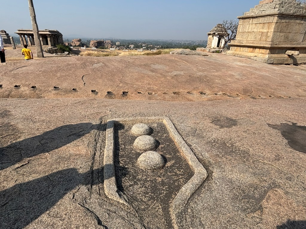 The Kings’ Balance (Tulapurusha Dana) is a simple yet powerful structure—two tall stone posts connected by a lintel, with a stone ring designed to hold a metal chain. According to tradition, the Vijayanagara emperors would stand on one side of the balance and be weighed against gold, grain, or precious stones. The offerings were then distributed to temple brahmins and the needy.