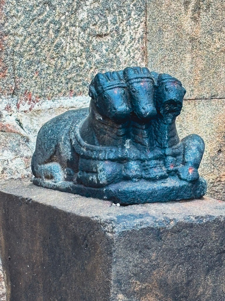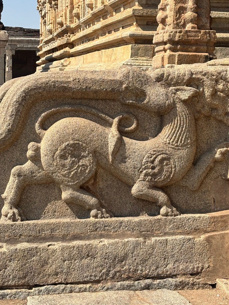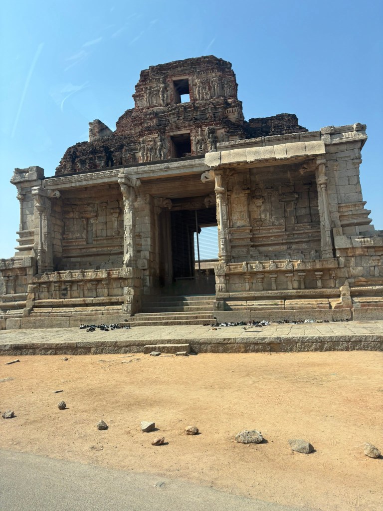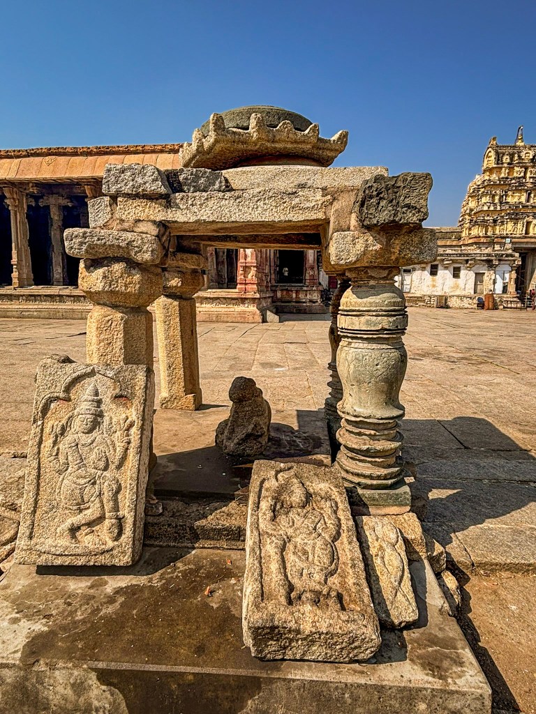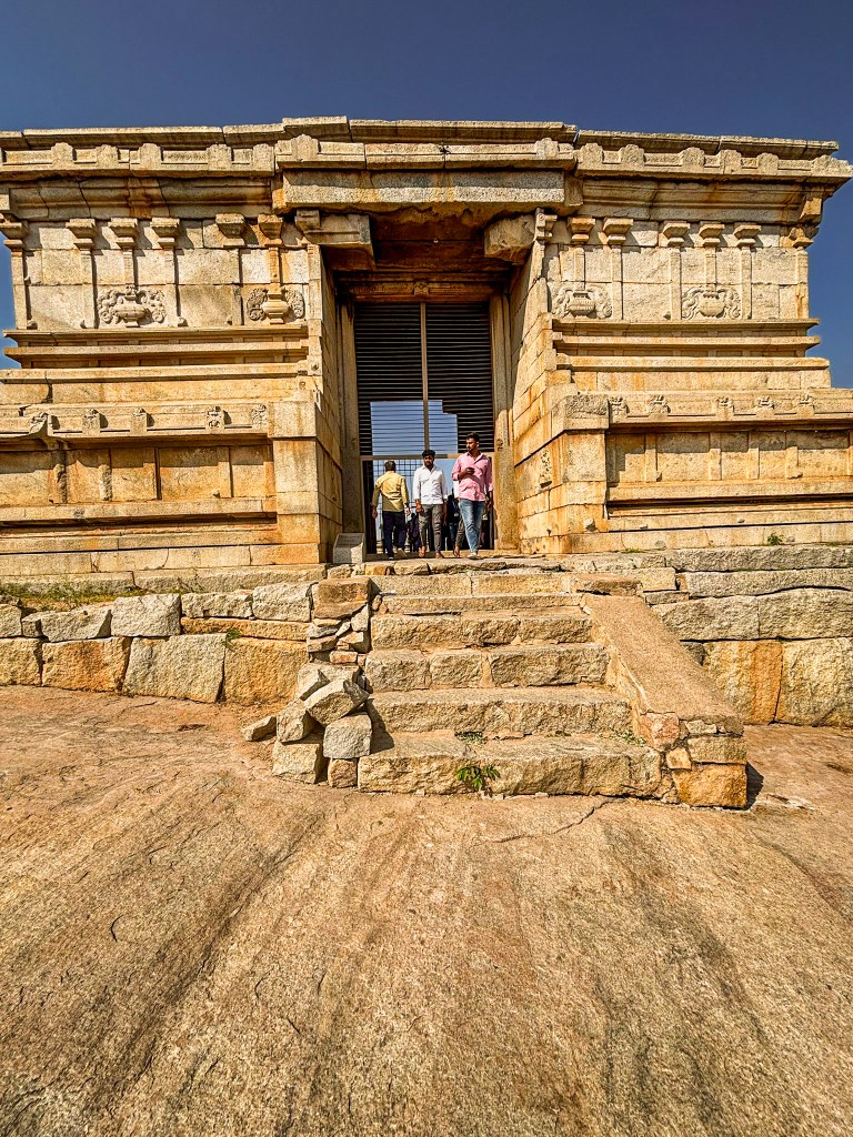 You can also visit the Narashimha temple on the same coracle ride. We ran out of time and couldn’t visit the temple. A short walk takes you through scattered boulders and ancient stone steps. They lead you to the temple. Its weathered facade blends seamlessly into the rocky hillside. The temple is a multi-story structure with characteristic Vijayanagara-style pillars. It has three sanctums originally dedicated to different forms of Vishnu: Venugopala, Lakshminarasimha, and Vishnu-Purushottama.