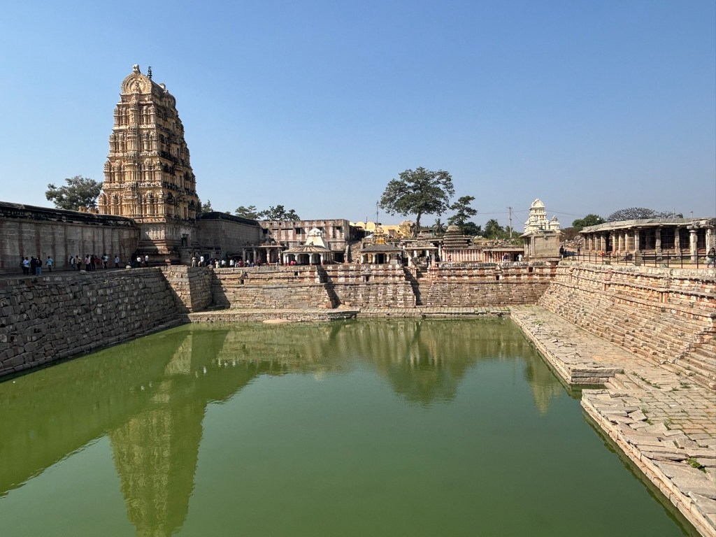 On the walk toward the Vijaya Vittala Temple, the landscape quietly opens up to one of Hampi’s most graceful water monuments—the Vittala Pushkarani. Tucked beside the northern stretch of the Vittala Bazaar, this stone‑stepped tank once anchored the ritual life of the temple and its bustling marketplace. Built during the height of the Vijayanagara Empire, it features a delicate central mantapa rising from the water, a signature of sacred reservoirs across the region.