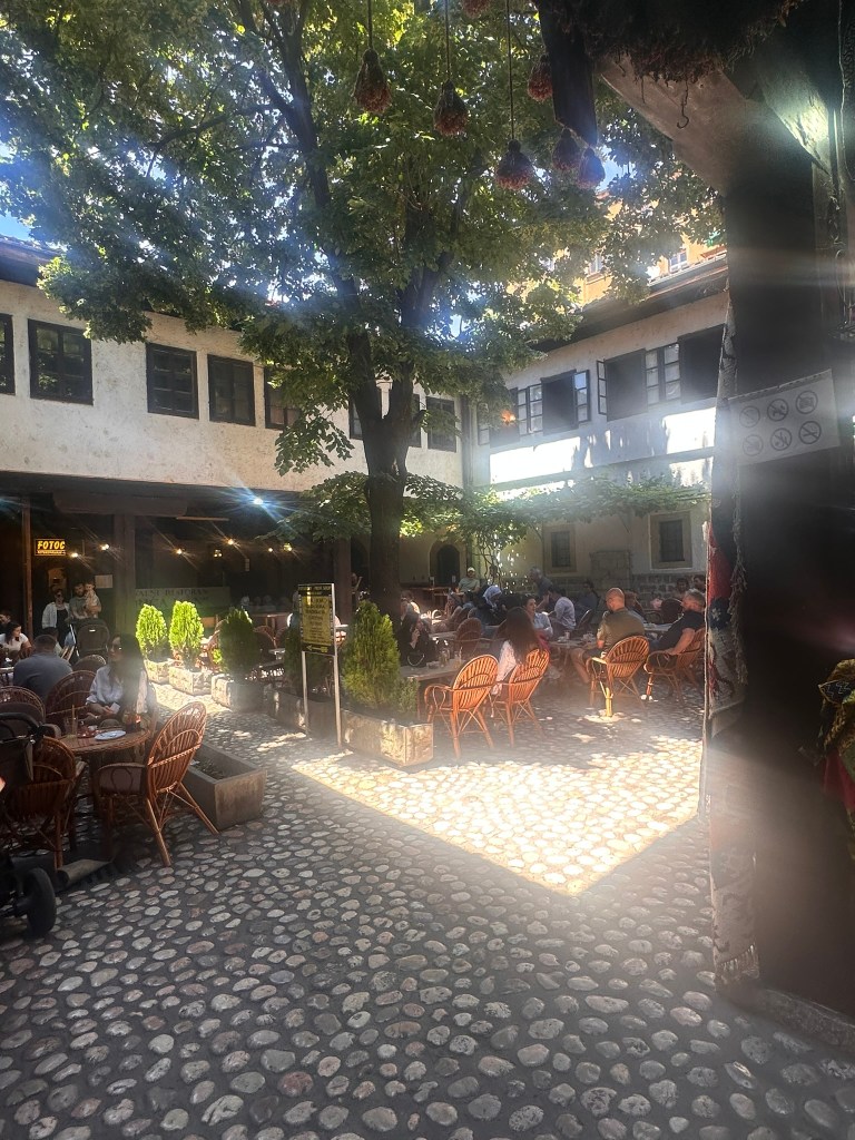 We stopped at Morića Han during our food tour and enjoyed Bosnian coffee and sweets. It’s a beautiful place to relax, drink coffee, and watch people. The inn was built in the heart of Baščaršija between the 16th and 17th centuries as part of an endowment established by Gazi Husrev Bey. The inn’s sleeping quarters could accommodate a caravan with 300 travelers and 70 horses. The room of the innkeeper was right above the main entrance, and the ground level was used for horses and goods. Upstairs, there were rooms for the travelers and a large coffeehouse.