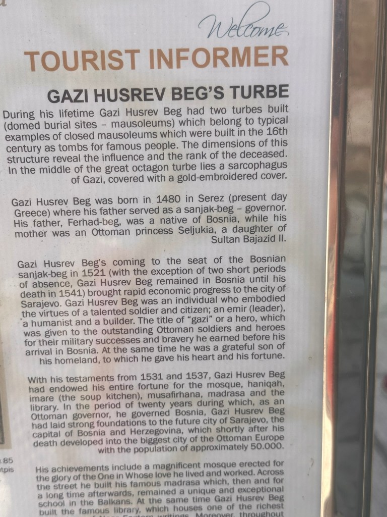 This is an active mosque and visitors are not allowed during prayer times. The exterior of the mosque features several tombs, including that of Gazi Husrev Beg himself, along with the resting places of other influential early residents of the city. Furthermore, the adjacent decorative garden and school complex (madrassa) offer additional insights into the historical significance of the area. The madrassa houses a small museum that sheds light on Huzrev-Beg’s life and his pivotal role in the city’s development, providing visitors with a deeper understanding of this remarkable historical figure and the era in which he lived.