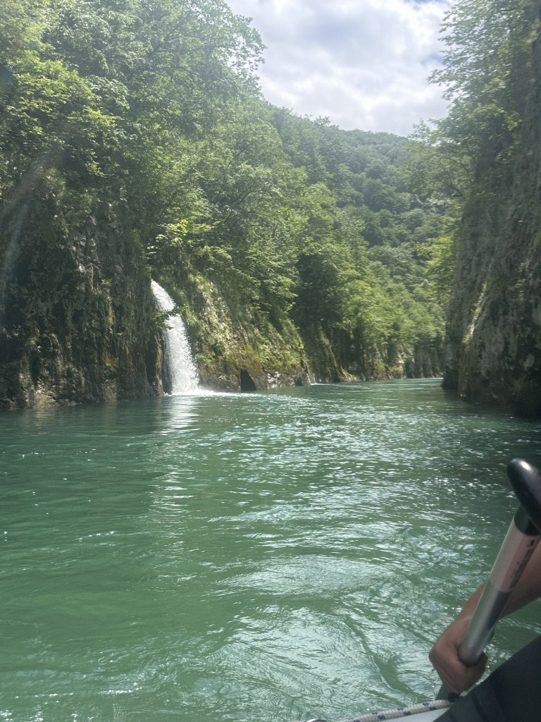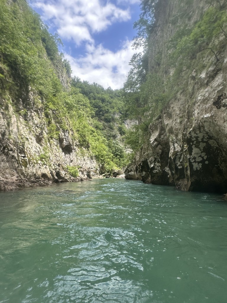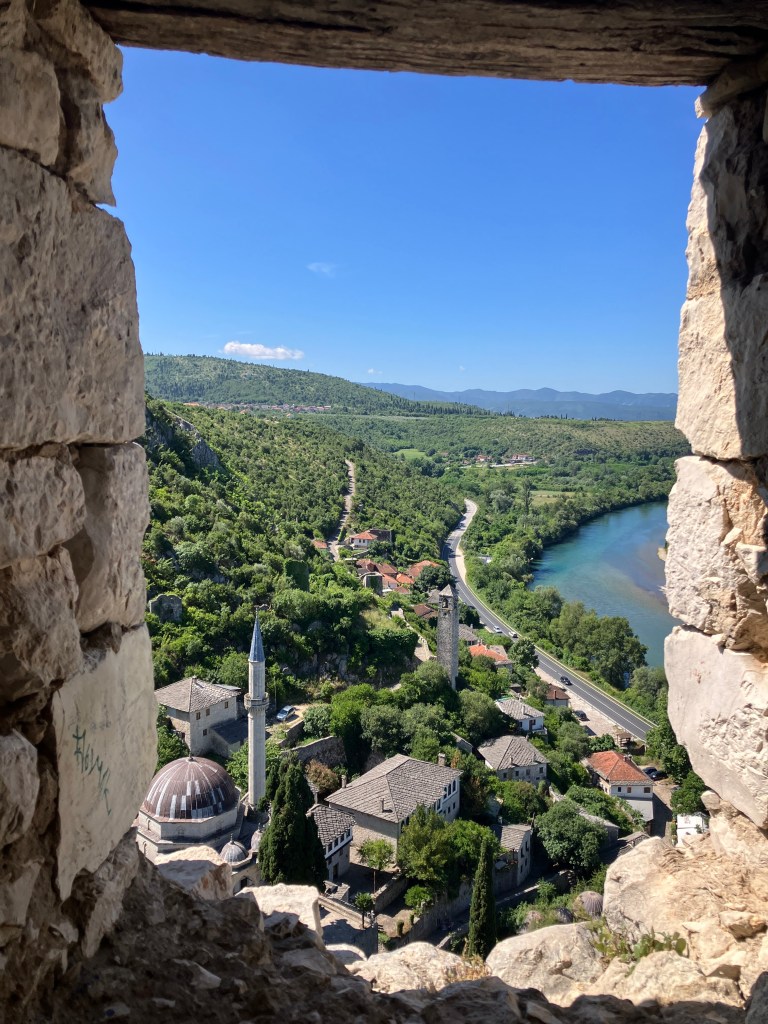 Rafting on the Neretva River is a popular activity in Konjic, and we did ours through Visit Konjic rafting company. There are several providers, and they all seem to follow the same route. When we did our rafting in mid-June, 2024, we were on the only ones on the entire 22 km path, but our guide informed us that during peak season of July and August, there might be as many as 100 rafts on the water. We enjoyed having this amazing canyon to ourselves and felt like the scenery is right out of middle earth with lush green tress, waterfalls and beautiful canyons. During June, the rapids were level II and III and very manageable.