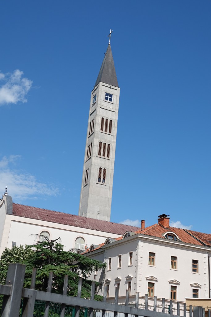 The Mostar Peace Bell Tower (Mostarski Zvonik Mira) is one of the first landmarks of Mostar we noticed as it dominates the landscape of Mostar. The bell tower of the church is the highest construction in the city, boosting 107m of height and you take an elevator will to more than halfway up, to 45 meters of the 75-meter-high viewing area, providing a panoramic 360-degree view. You can walk up the remaining 30 meters.