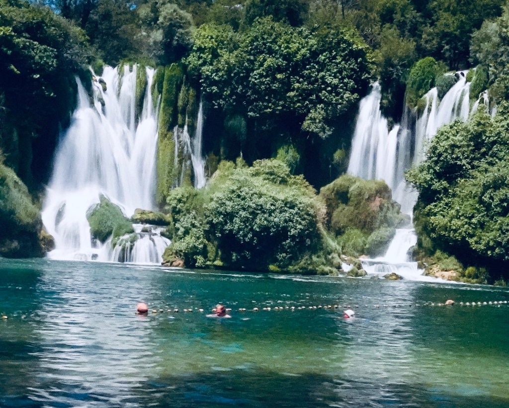 Kravica Waterfall located on the Trebižat River around 40 kilometers from Mostar and about three kilometers from the town of Ljubuški in Herzegovina. This is another great stop on the way to Croatia from Bosnia or as day trip from Mostar, Dubrovnik or Split. We stopped here on our way to Split and Mostar and spent couple of hours enjoying the beautiful waterfalls and swimming in the crystal-clear waters. The waterfall at the top has the shape of a semicircle about 120 meters wide, and is composed of travertine.