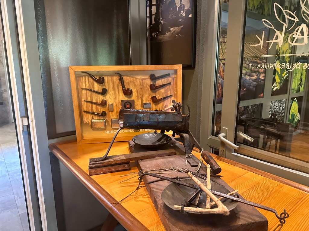 The restaurant and museum is located in the last tobacco factory in Herzegovina where you can see the world history of tobacco including photos of world-famous smokers, tobacco advertising, cuban cigars history, the influence of Austria-Hungary on the areas, information about tobacco factories, cigarette and tobacco packaging, smoking accessories including match books, as well as numerous literatures on the topic of tobacco. Tobacco users today can see all possible cigarettes and matches from this area in one place. From “Opatija” to “Croatia”f From “Drina” to “Vardar”, later the banned “Filter 170”, whose packaging most closely resembled “Marlboro”, to the partisan “Zeta” of the “Boris Kidrič” Tobacco Plant from Gjilan, then “Benston”, “Lord”, “Ibar”, “Drava”… and finally domestic products “Ljubuški, Look and Blend”. It is a fascinating place that also serves great food. Everyone in our group really enjoyed this place.