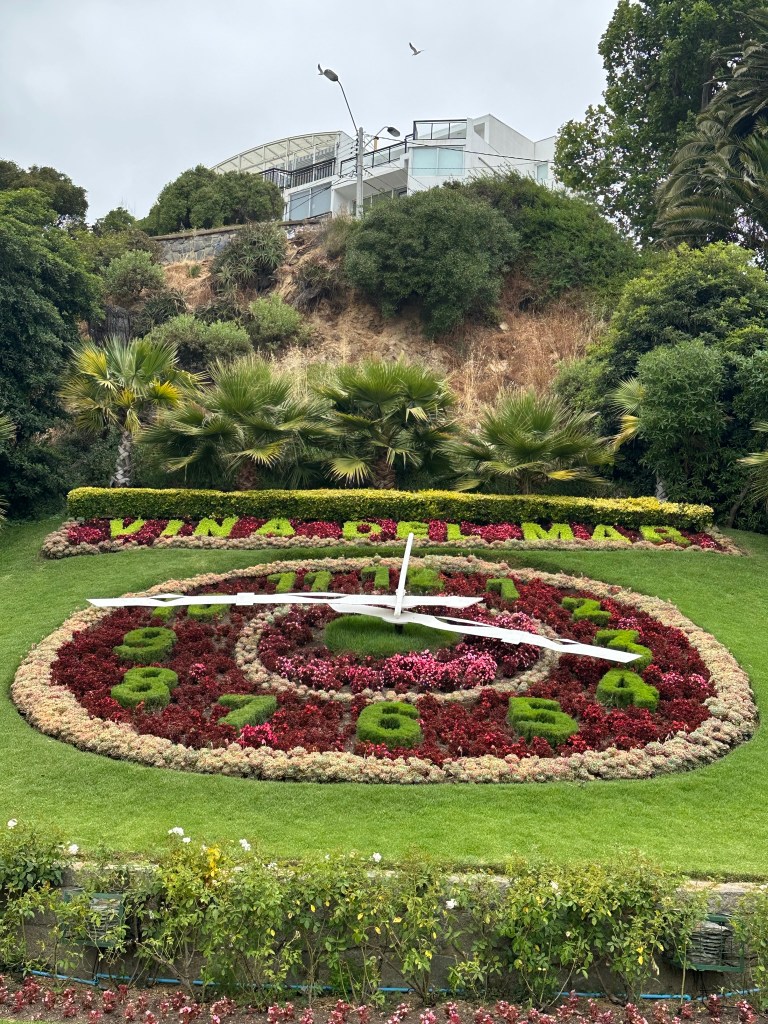 Vina Delmar is known as the garden city of Chile and is a vacation town. On Christmas Day, when we visited, there were plenty of Chileans relaxing with friends and family on the beach. One of the main highlights of Vina del Mar is the flower clock, and you climb the stairs behind the clock to get the view of the city.