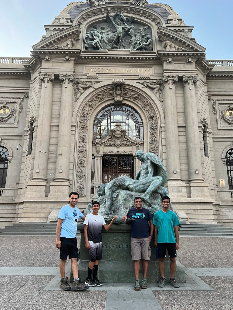 • National Museum of Fine Arts – This museum is free to enter, but we chose not to explore it. However, check out sculpture called Icaro y Dรฉdalo located outside of the building. The inscription “United in Glory and Death” refers to the myth of Daedalus, who made wings to escape imprisonment. Icarus flew too high and too close to sun, causing his wings to melt, and he fell into the sea. The statue of the mourning father is a copy; the original by Rebeca Matte, Chile’s first female sculptor, is in Rio de Janeiro, Brazil.