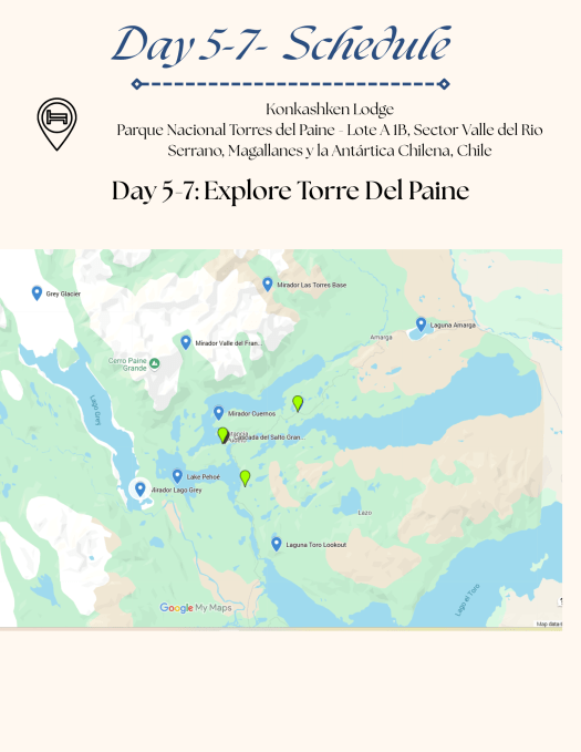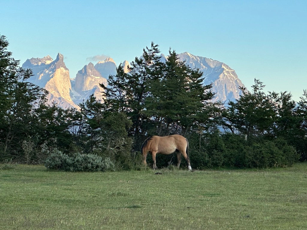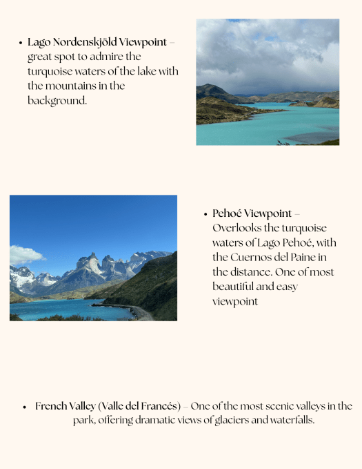 Even though we are not serious hikers, we enjoyed walking on flat paths with stunning views and minimal effort. Each lookout gave us a new perspective of the beautiful park, from mountains to clear lakes, making our trip worthwhile. I recommend against visiting for just one day, as the weather in Torre Del Paine is unpredictable. When we visited, the first two days were cloudy and rainy, but we still saw amazing scenery. Heavy winds started on the afternoon of day two, keeping us inside our cabins. On day three, we woke up to sunshine and clear skies, but the wind continued, preventing us from going on the Gray Glacier boat trip. We chose to revisit some viewpoints since the wind had cleared the skies, and day three ended up being the sunniest day of our visit.