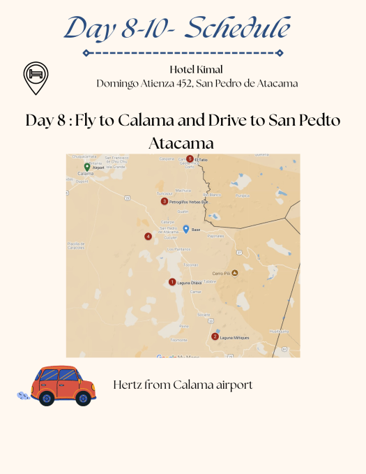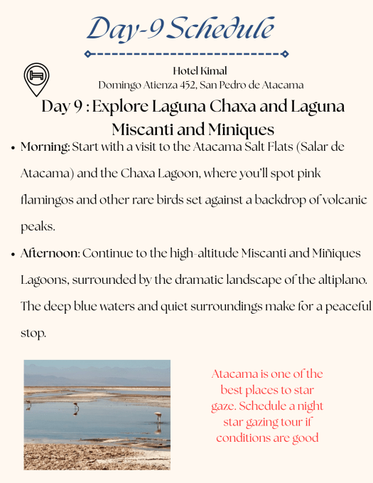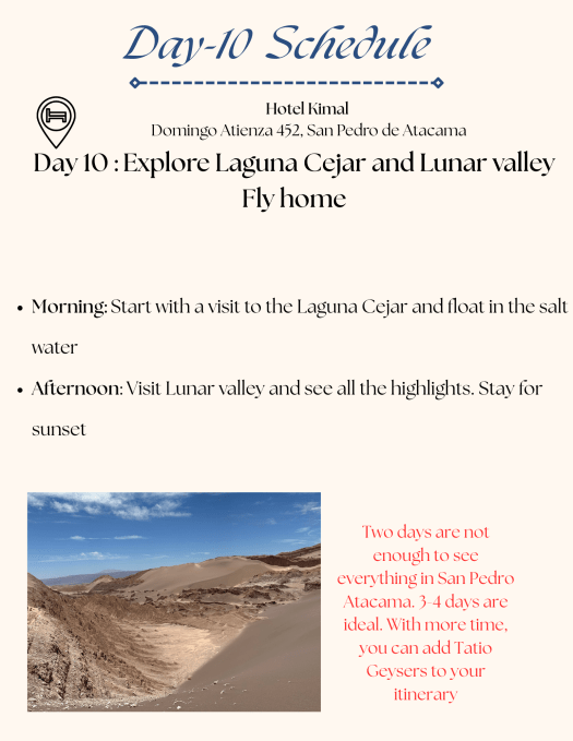 What we did: Spent 2 days in San Pedro Atacamam and did self-guided tours( Ideal would be 3-4 days to cover everything)