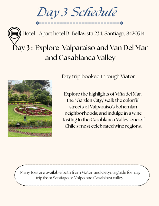 Guided Tours – There are several guided tours available on Viator and GetYourGuide that have day trips from Santiago that include Valpo, Viรฑa del Mar, and Casablanca Valley (wine tasting), such as this one.