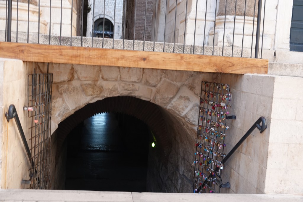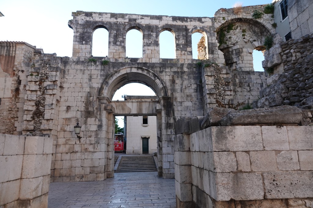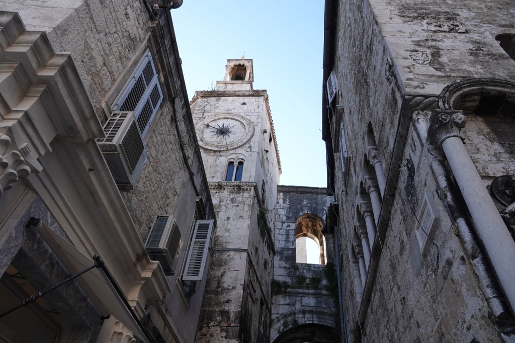 Before we went to Split, I thought Diocletian’s palace was a walled city with Palace at the center but in reality, the old town of split and the palace are intertwined with each other and it is the living, breathing, vibrant heart of Split. In fact, 3000 people live in the hodgepodge of palace and old city of Split and the winding narrow streets are filled with restaurants, gift shops, homes, cloth lines, flowerpots, ATMs etc. People live, work, and eat in the UNESCO site and is the only inhabited roman ruin. It is fascinating to walk through these streets to realize that you are walking on the same path that Diocletian walked centuries ago but now regular people live here. It is very easy to get lost and I enjoyed getting lost on purpose in the winding streets and popping out of the old town at various locations and discovering fascinating views this palace has to offer (I did this at 7AM and not very many people around and highly recommend doing this).
