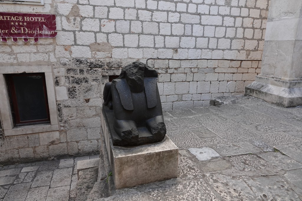 In addition to the sphinx at the Peristyle, there is a headless “companion” in front of the Temple of Jupiter (baptistery) that is also popular. Fragments of other sphinxes, including a red granite head that used to be in Diocletian’s Palace, are displayed in museums and cellars in Split.