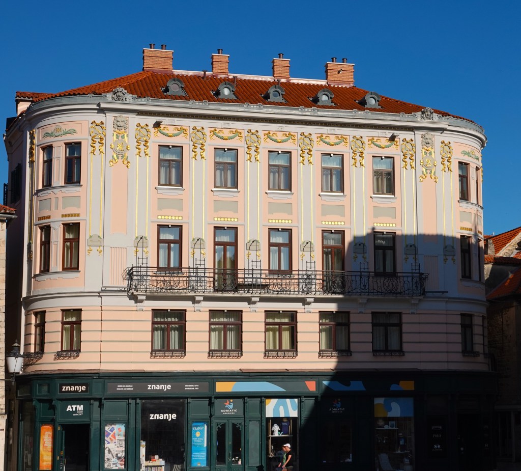 House Nakić in Split- Built between 1901-1906 as the private house of the furniture dealer Vicko Nakić, this is monumental three-story building with an irregular trapezoidal floor plan with a small inner courtyard and possibly the oldest art Nouveau building in Split. I loved the beautiful design and constrating color of green and yellow