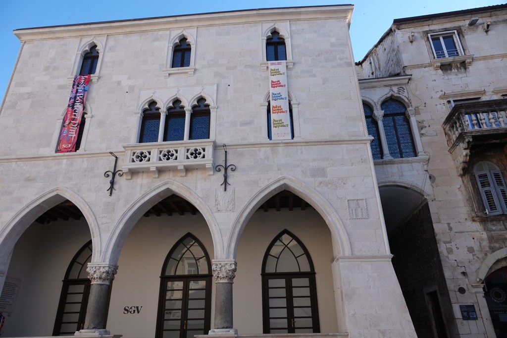 The Gothic-style Old Town Hall is situated in Narodni Square, adjacent to the walls of Diocletian’s Palace. It stands as the sole remaining structure of a complex that was obliterated in 1825, which formerly encompassed the Rector’s Palace, the theater, and the city jail. The building underwent renovation in the neo-Gothic style in 1890. From 1910 until 2005, it served as the ethnographic museum; however, presently, the palace is utilized for temporary exhibitions showcasing works by local artists, as well as for various events. This three-story edifice, during its tenure as the town hall, had its upper levels allocated for administrative functions.