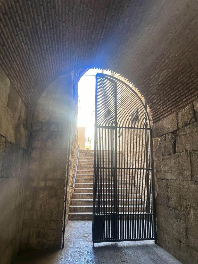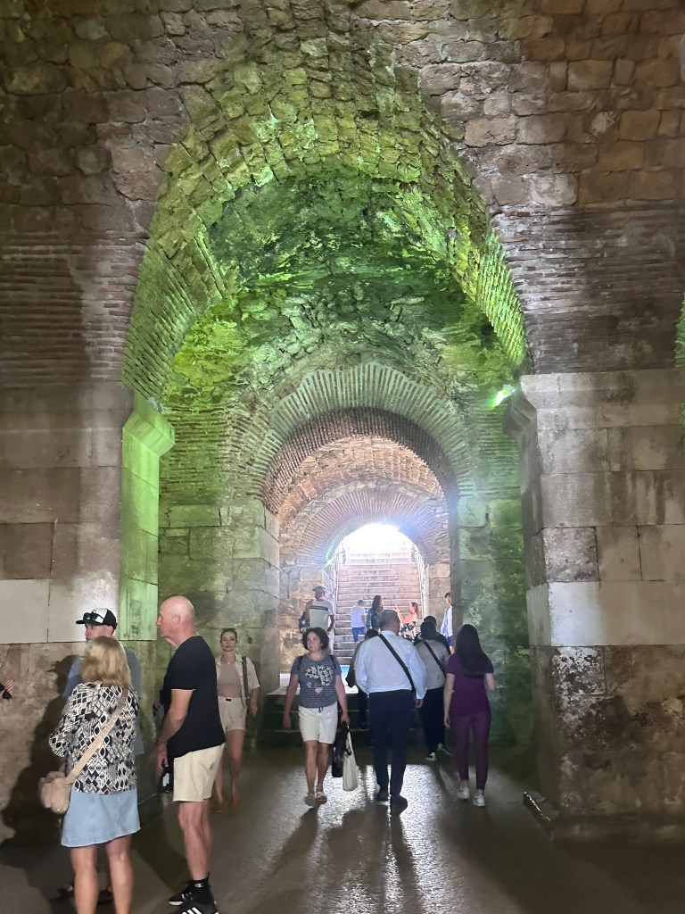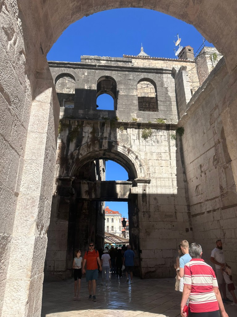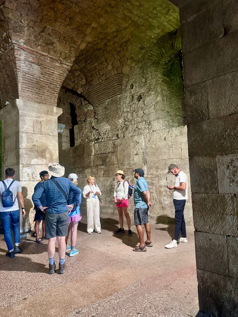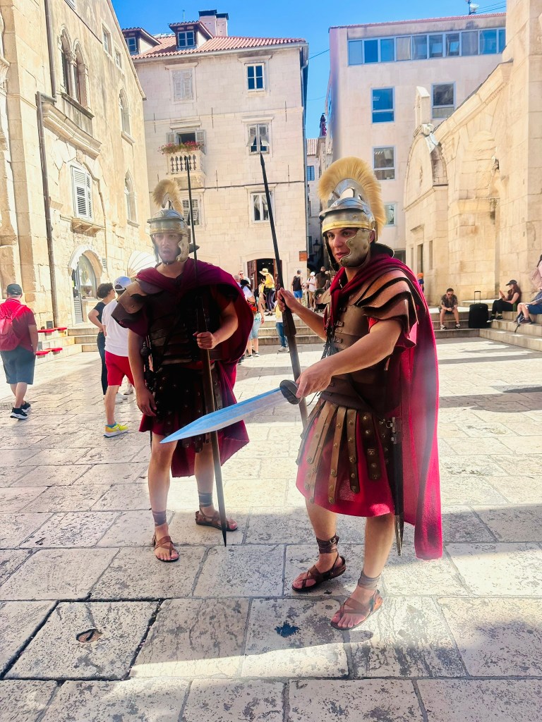 The Peristyle was lively with visitors when we saw it in the afternoon after our tour (I had taken photos at 7 AM, enjoying the lack of crowds). Every day at noon in summer, Croatian students dressed as Roman centurions perform a reenactment of the Roman changing of the guard. Diocletian and his wife Priska, dressed in beautiful gowns and accompanied by their visible Praetorian Guard, stand in the center to greet everyone. Diocletian then gives a welcoming speech in both Latin and English, inviting, “Please come and explore my palace!” At night, the Peristyle becomes a bright and lively place, drawing a mix of locals and tourists who come to enjoy live music or street performances.